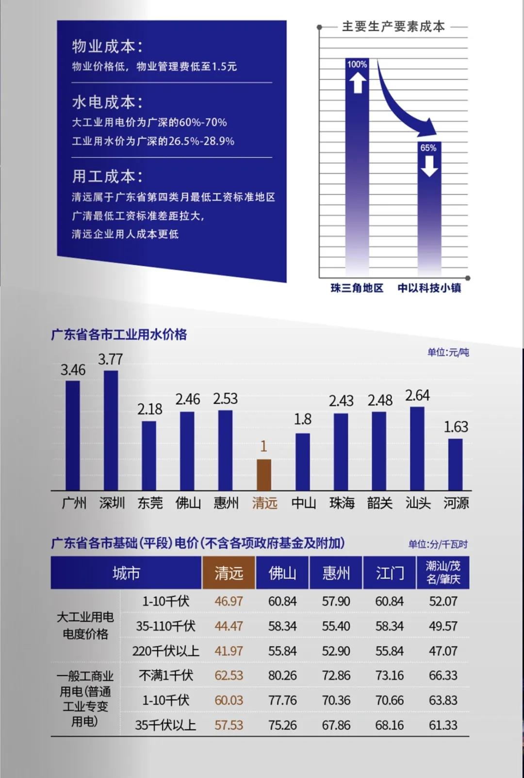 清远用地成本低廉,大工业用电价为广深的60%-70%,工业用水价为广深的26.5%-28.9%。人工、水电、物流等综合成本较广深低50%以上,以低成本,生产高额利润。